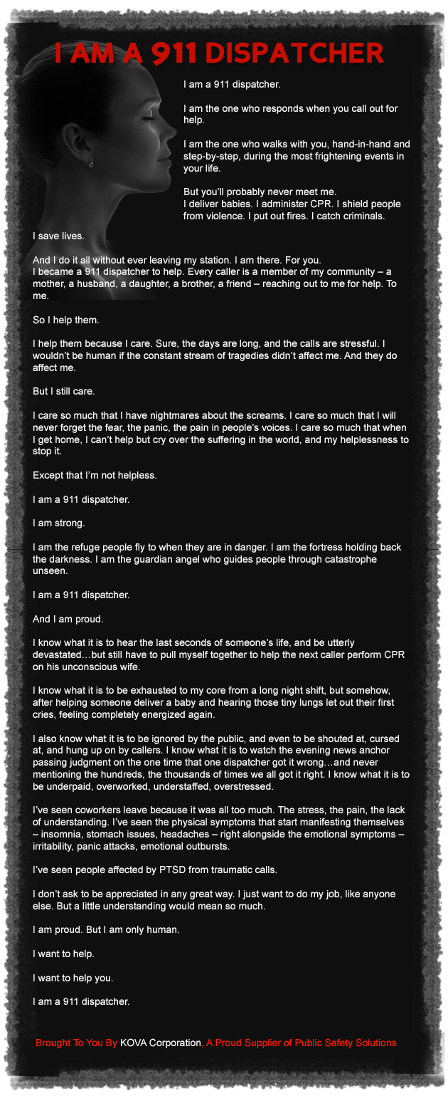 I also know what it is to be ignored by the public, and even to be shouted at, cursed at, and hung up on by callers. I know what it is to watch the evening news anchor passing judgment on the one time that one dispatcher got it wrong…and never mentioning the hundreds, the thousands of times we all got it right. I know what it is to be underpaid, overworked, understaffed, overstressed.